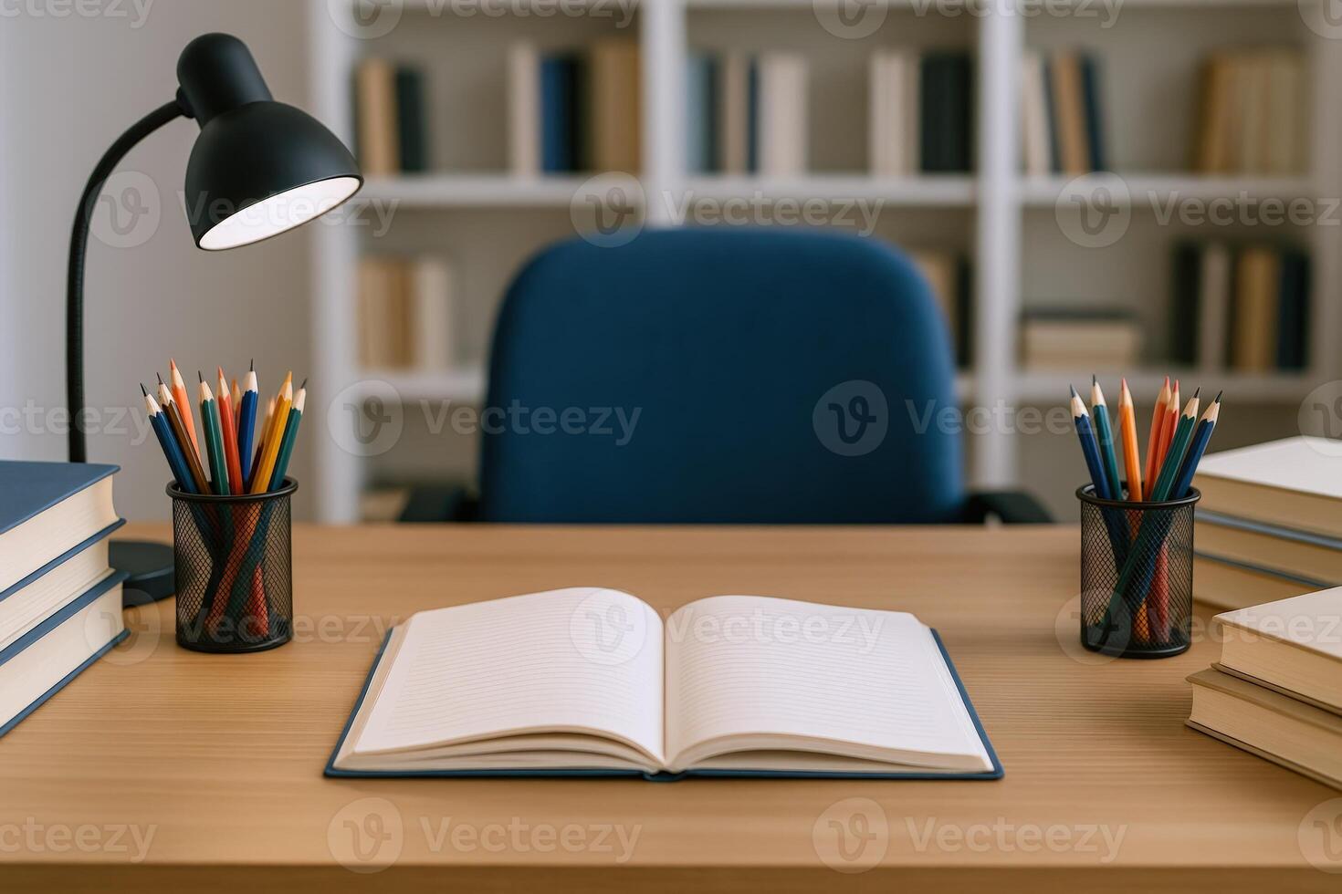 Open Notebook on Wooden Desk in Study Room with Bookshelf Background, Education and Learning Concept Pro Photo