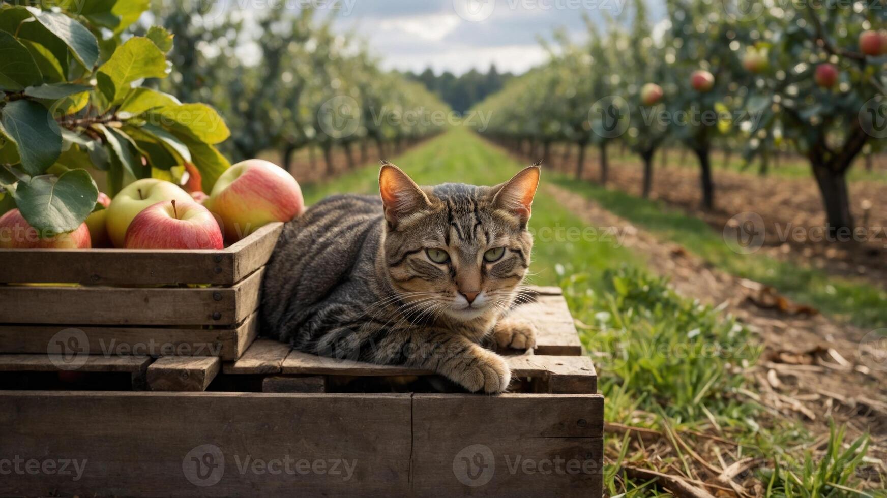 Cat lounging on a wooden crate beside fresh apples in an orchard, with rows of apple trees in the background Pro Photo