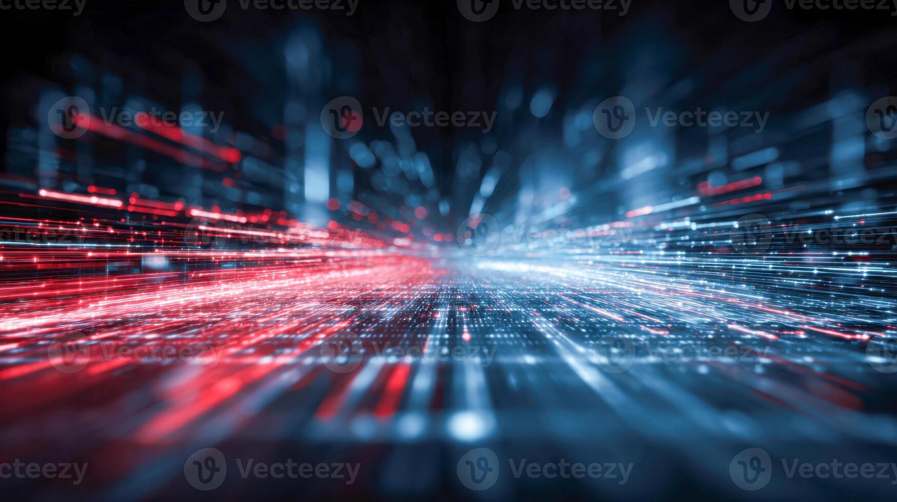 A futuristic digital landscape with dynamic streaks of red and blue lights creating a sense of high-speed data transfer and technological advancement in a dark, immersive environme Pro Photo