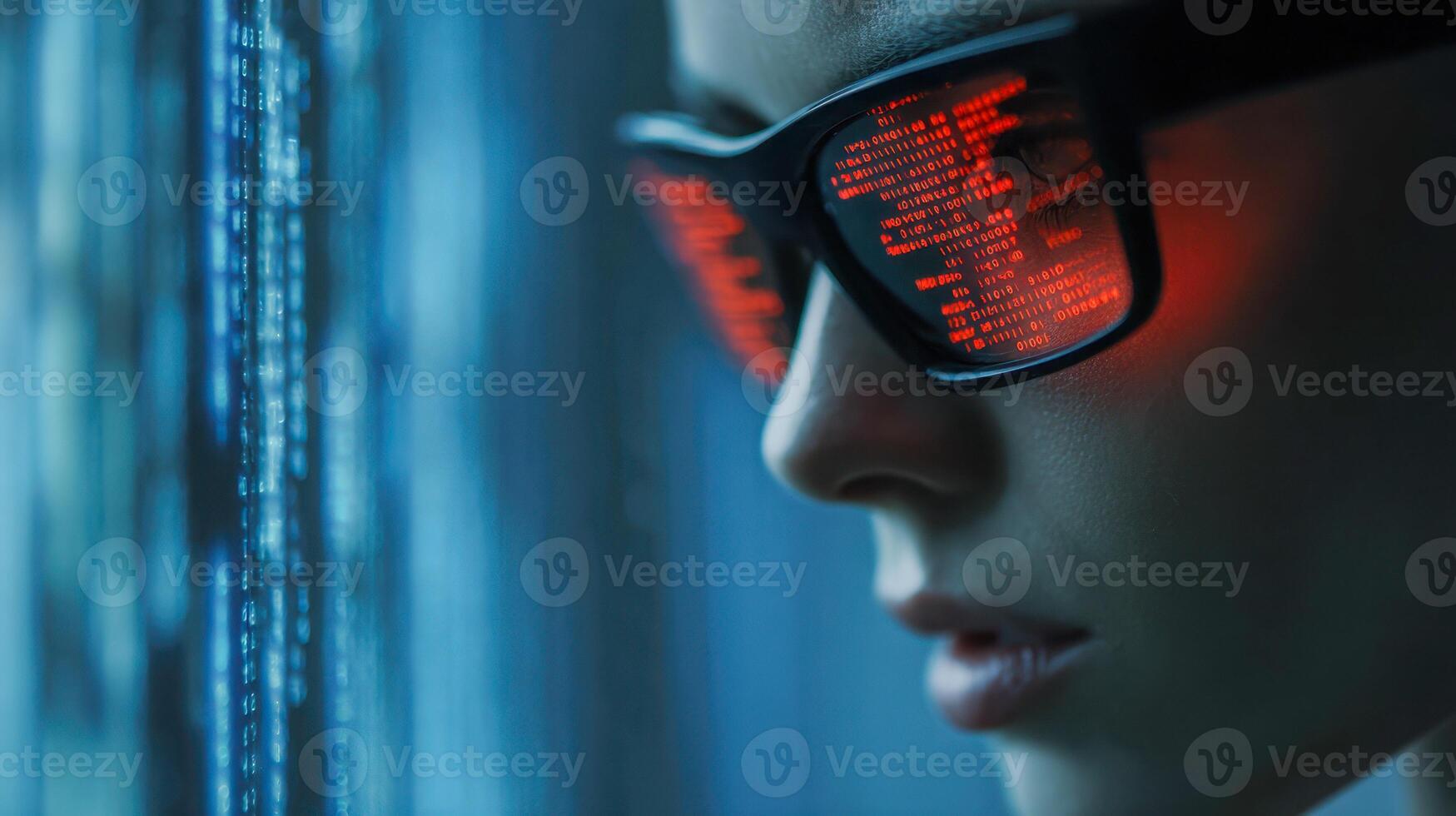 Focused person wearing reflective sunglasses with red coding reflected on lenses analyzing digital data streams on blue background in cybersecurity context Pro Photo