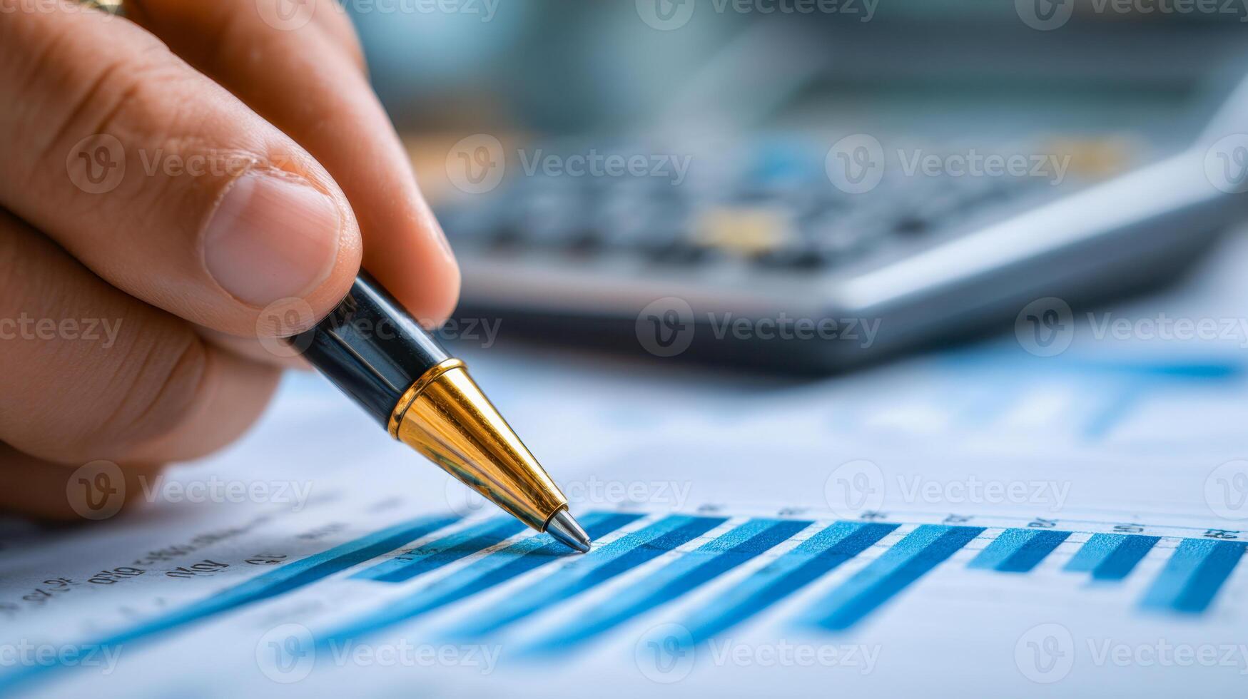 Person analyzing financial data and bar charts with a pen while using a calculator for accurate business planning and statistical review Pro Photo