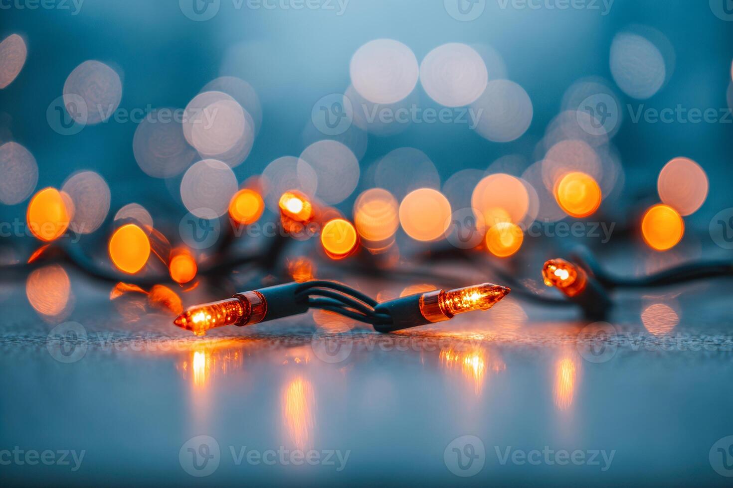 Close-up of glowing orange string lights creating a warm bokeh effect on a reflective surface with a cool blue background ambiance for festive decoration Pro Photo