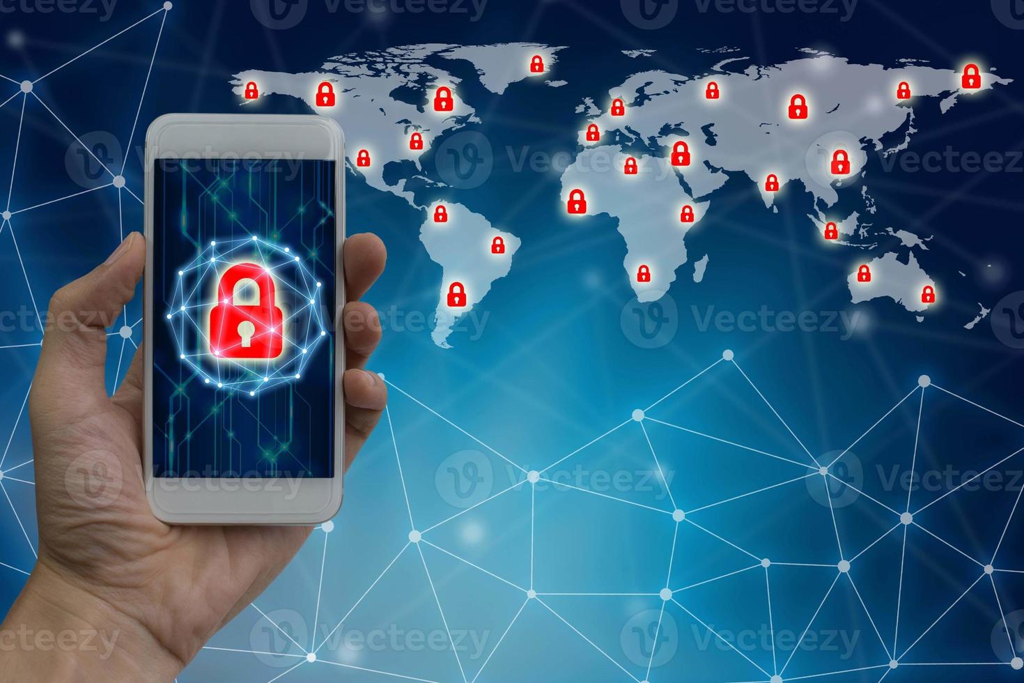 Man using smartphone with lock networking virtual screen of global network security, Cyber security internet and networking concept Pro Photo