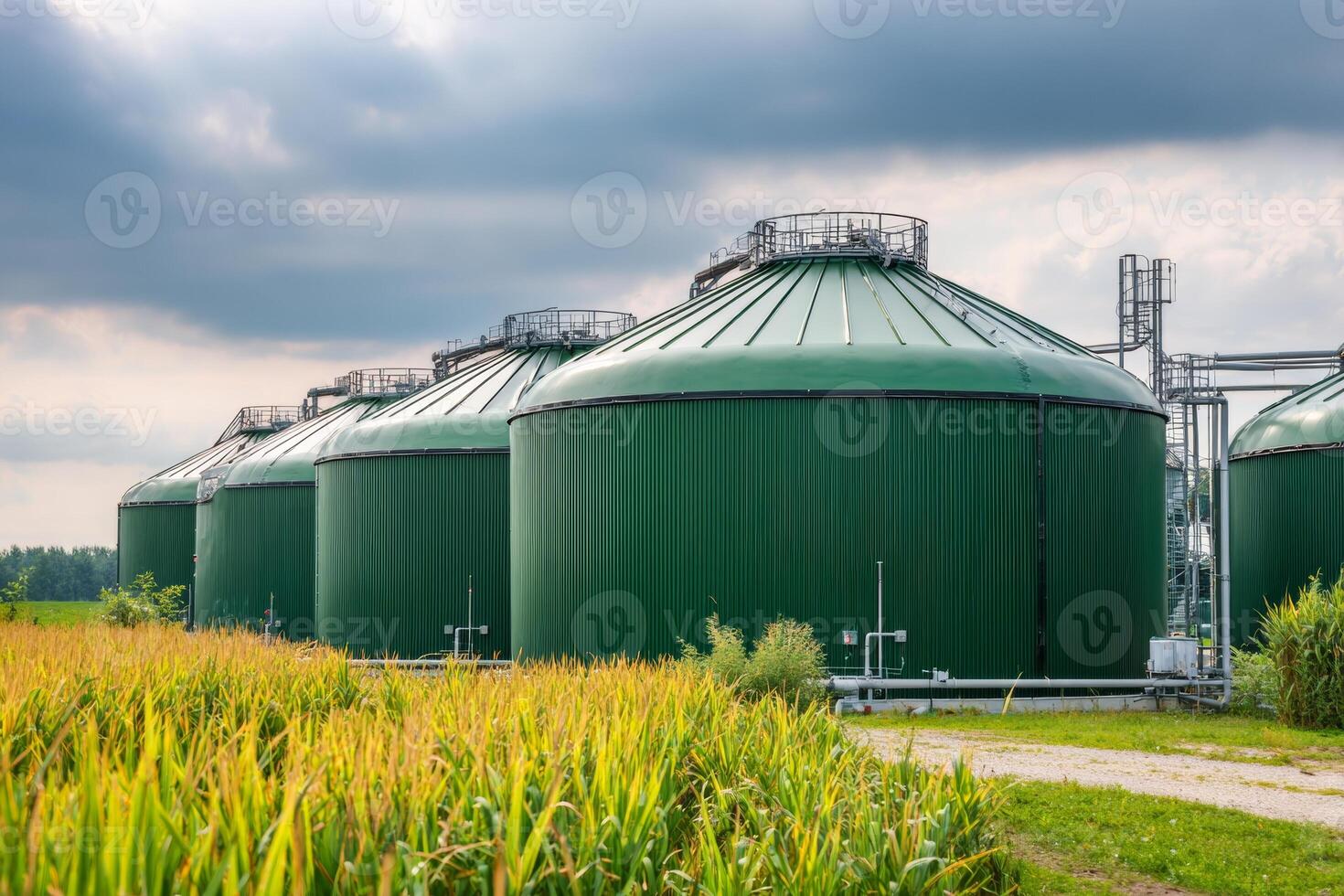 Large green biogas storage tanks are lined up in an agricultural area, with vibrant fields in the foreground and a cloudy sky overhead. The setting highlights renewable energy efforts in farming Pro Photo