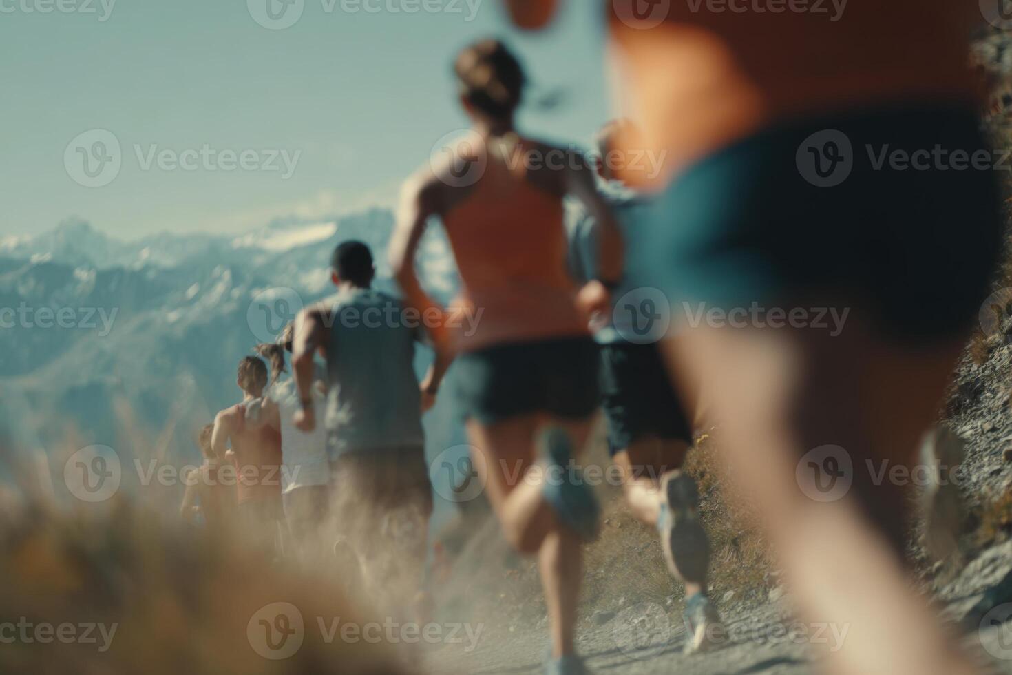 Participants are engaged in a mountain trail running event under clear skies. The rocky terrain and scenic views create a challenging atmosphere as they push their limits Pro Photo