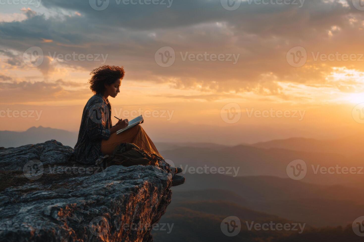A person sits on a rocky outcrop, sketching in a notebook as the sun sets. The vibrant colors of the sky contrast with the distant mountains, creating a serene atmosphere Pro Photo