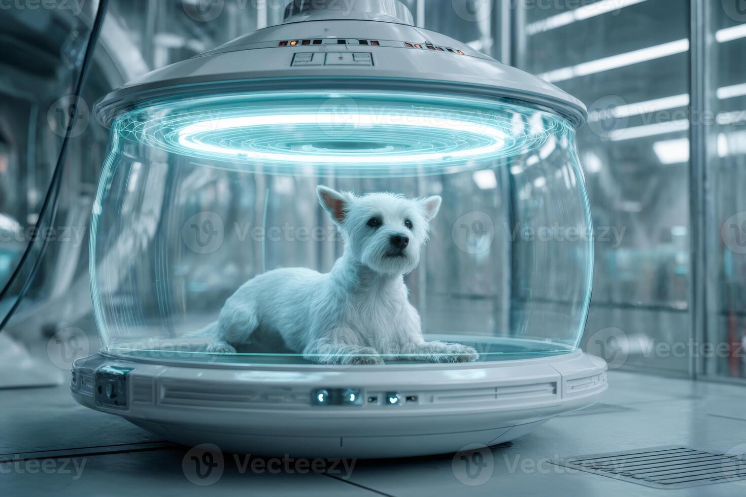 A small white dog is resting in a transparent containment pod within a bright, advanced laboratory. The environment showcases modern technology and design elements Pro Photo