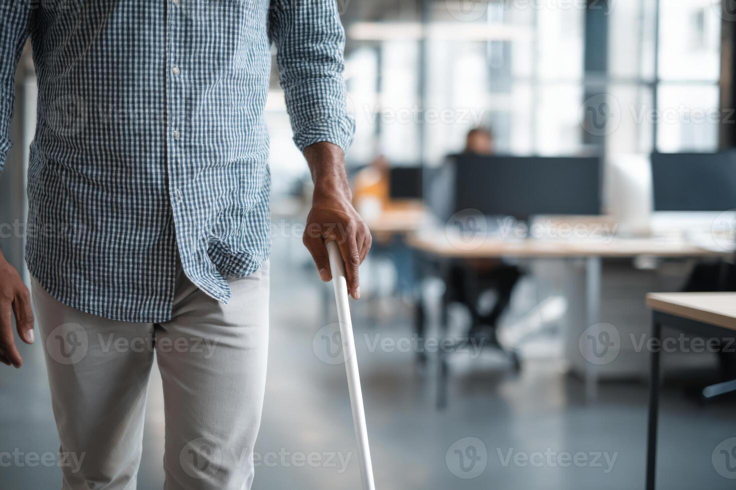 Individual using a white cane while walking through a spacious office environment filled with desks and computers, showcasing accessibility solutions in a contemporary workplace Pro Photo