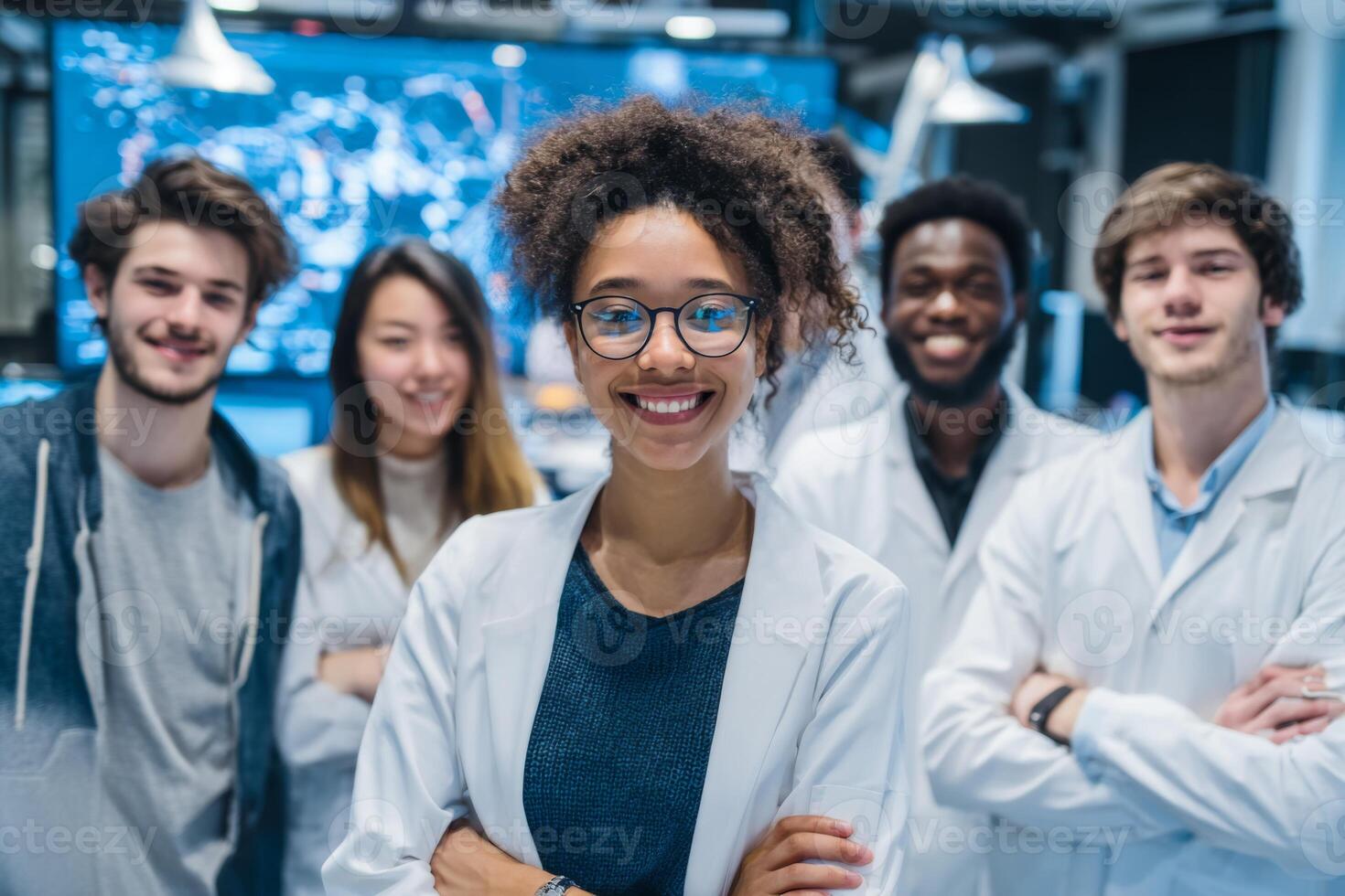 Five young researchers, dressed in lab coats, stand together in a modern lab filled with technological equipment, smiling confidently and displaying their teamwork and dedication to science Pro Photo