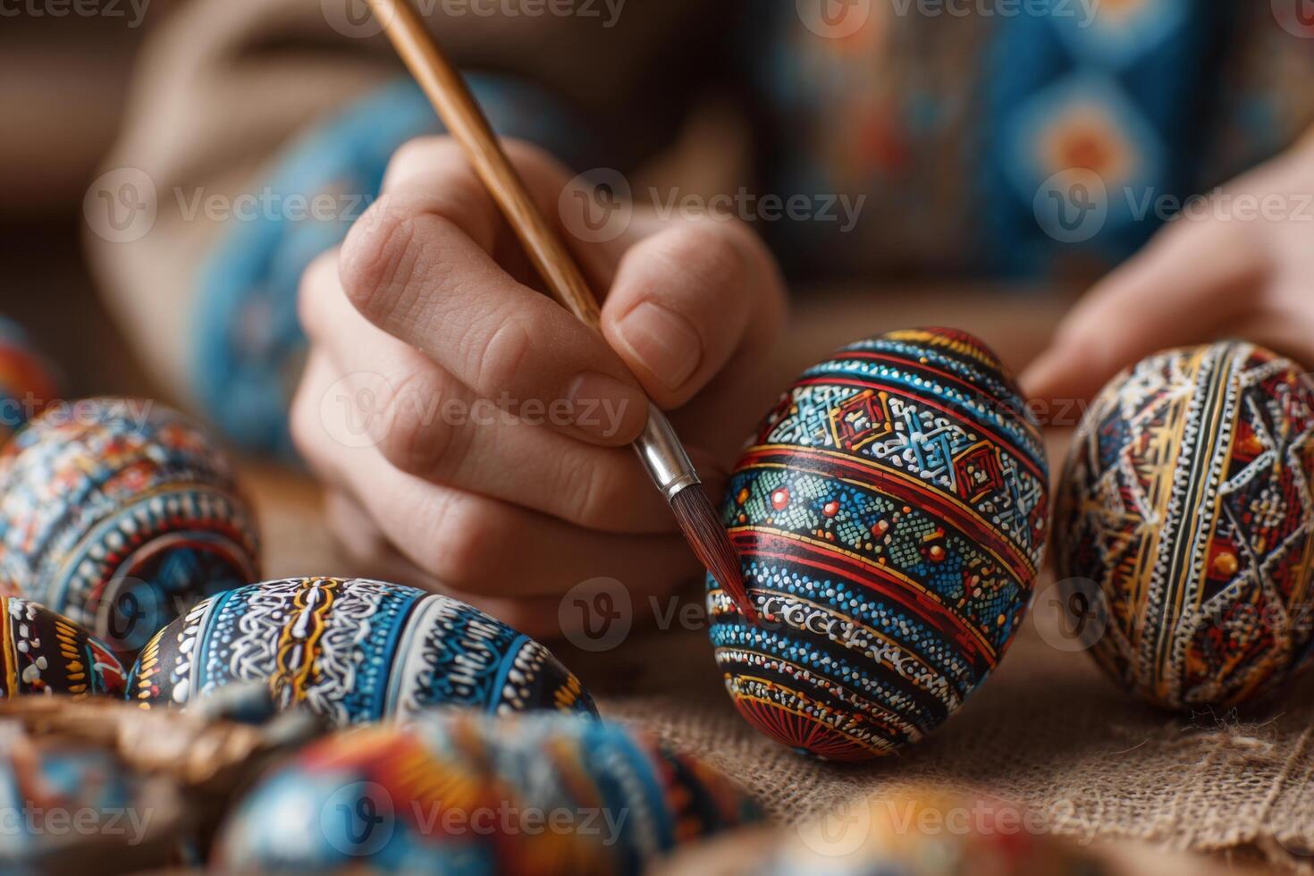 Artisan focuses on applying vibrant patterns to ornately designed eggs during a creative session in a workshop filled with artistic supplies and inspiration Pro Photo