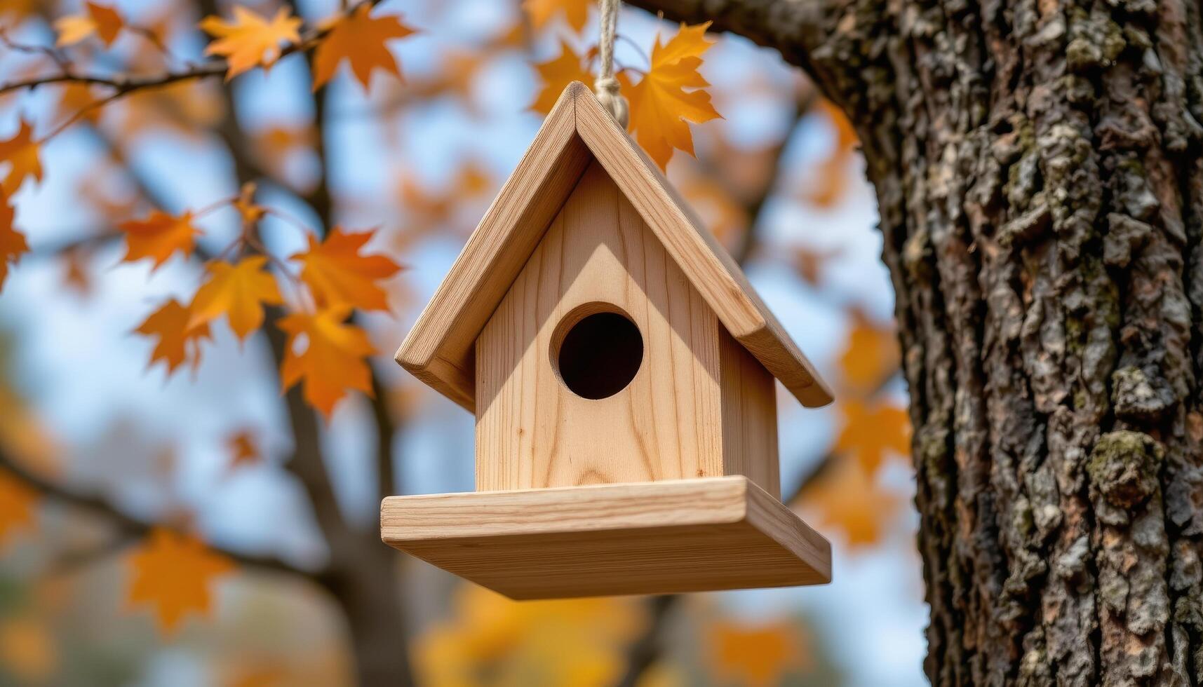 simple triangular birdhouse, natural wood, pointed roof, hanging by string from maple tree. Free Photo