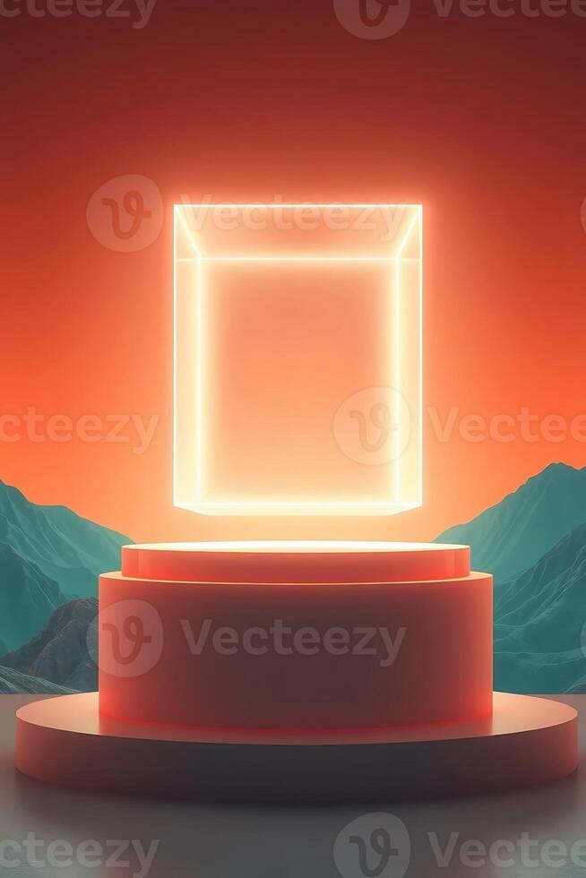 Abstract illuminated cube floating above minimalist platform with mountain backdrop, modern design concept Pro Photo