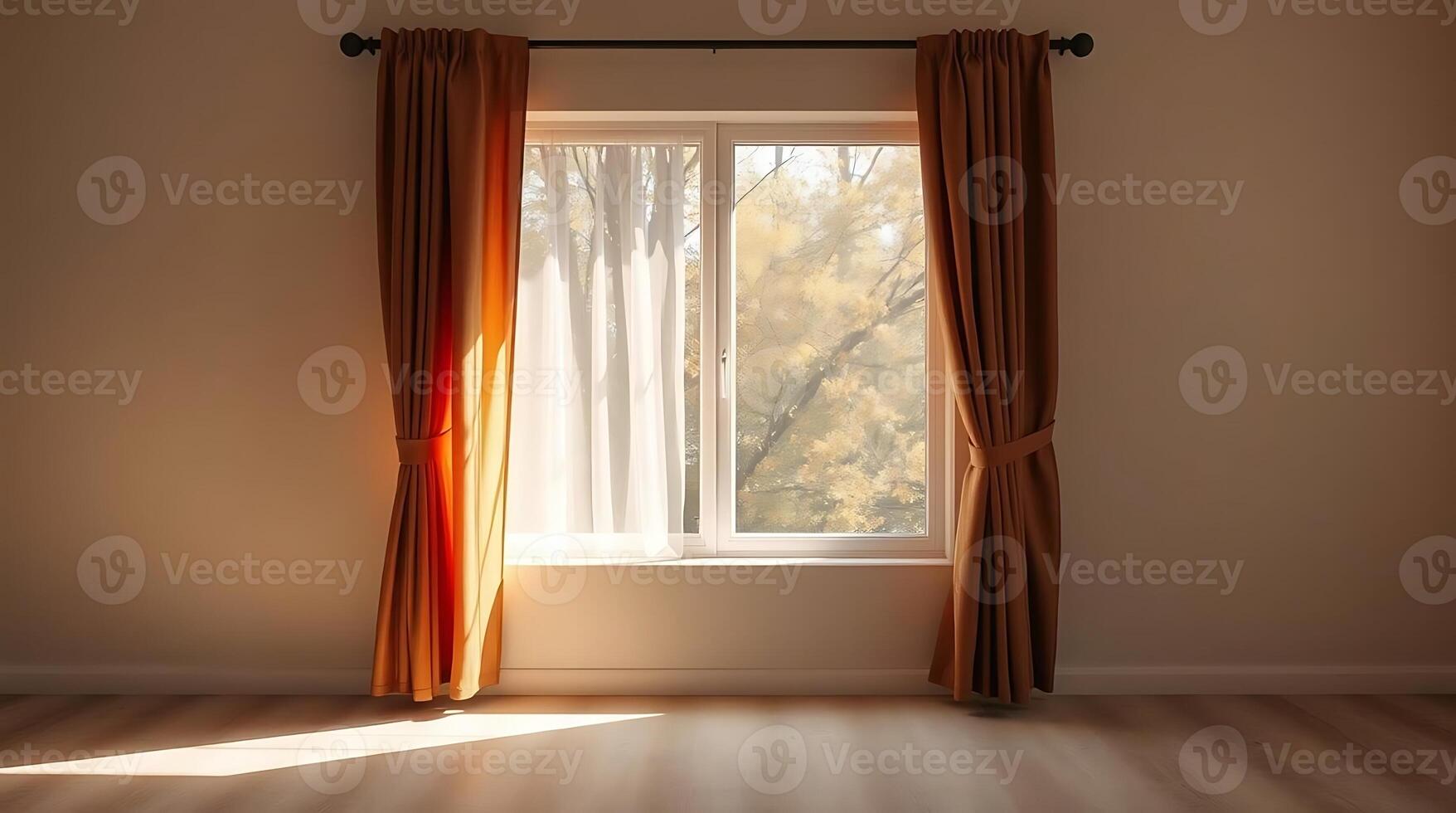 Sunlight streams through window with flowing curtains creating a warm inviting and serene atmosphere indoors Pro Photo