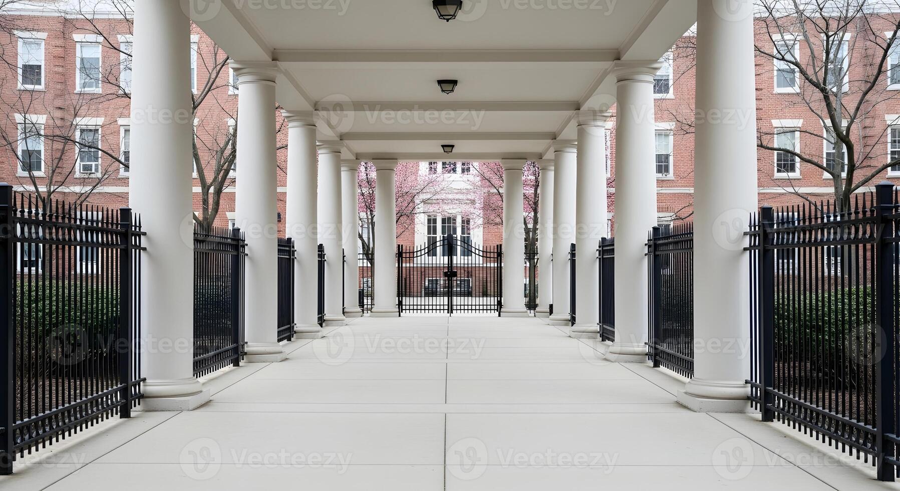Elegant Architecture Columns Gate and Brick Building in Spring Pro Photo