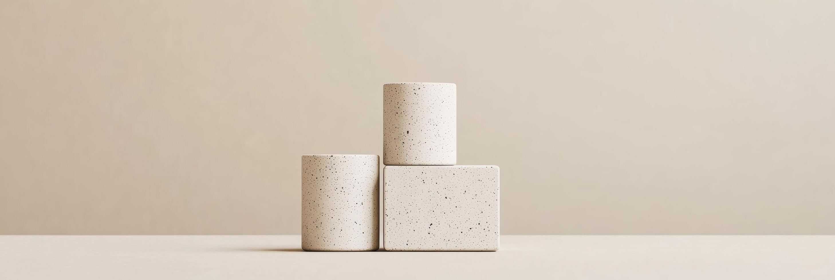 Three simple objects in soft white with speckles are arranged on a flat surface photo