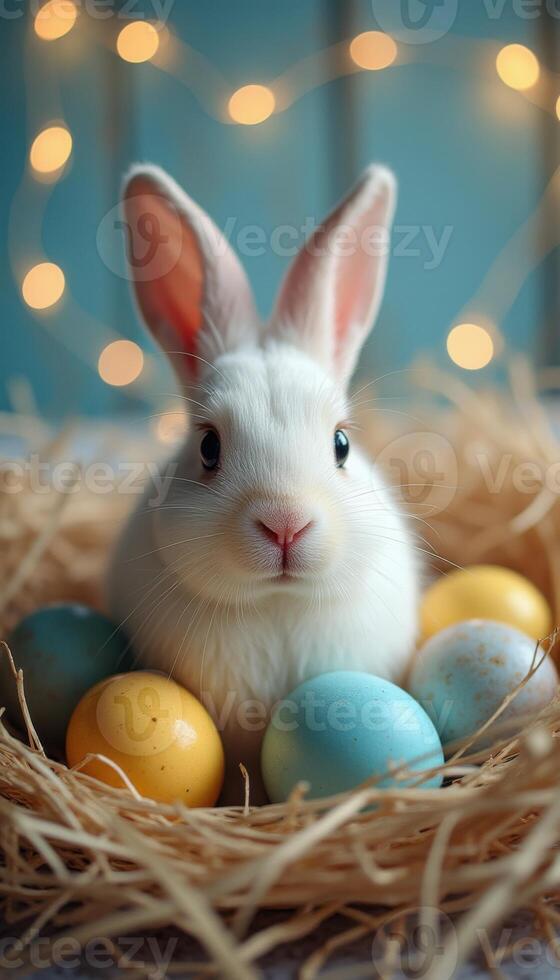 A white rabbit is sitting in a nest with colorful eggs Pro Photo
