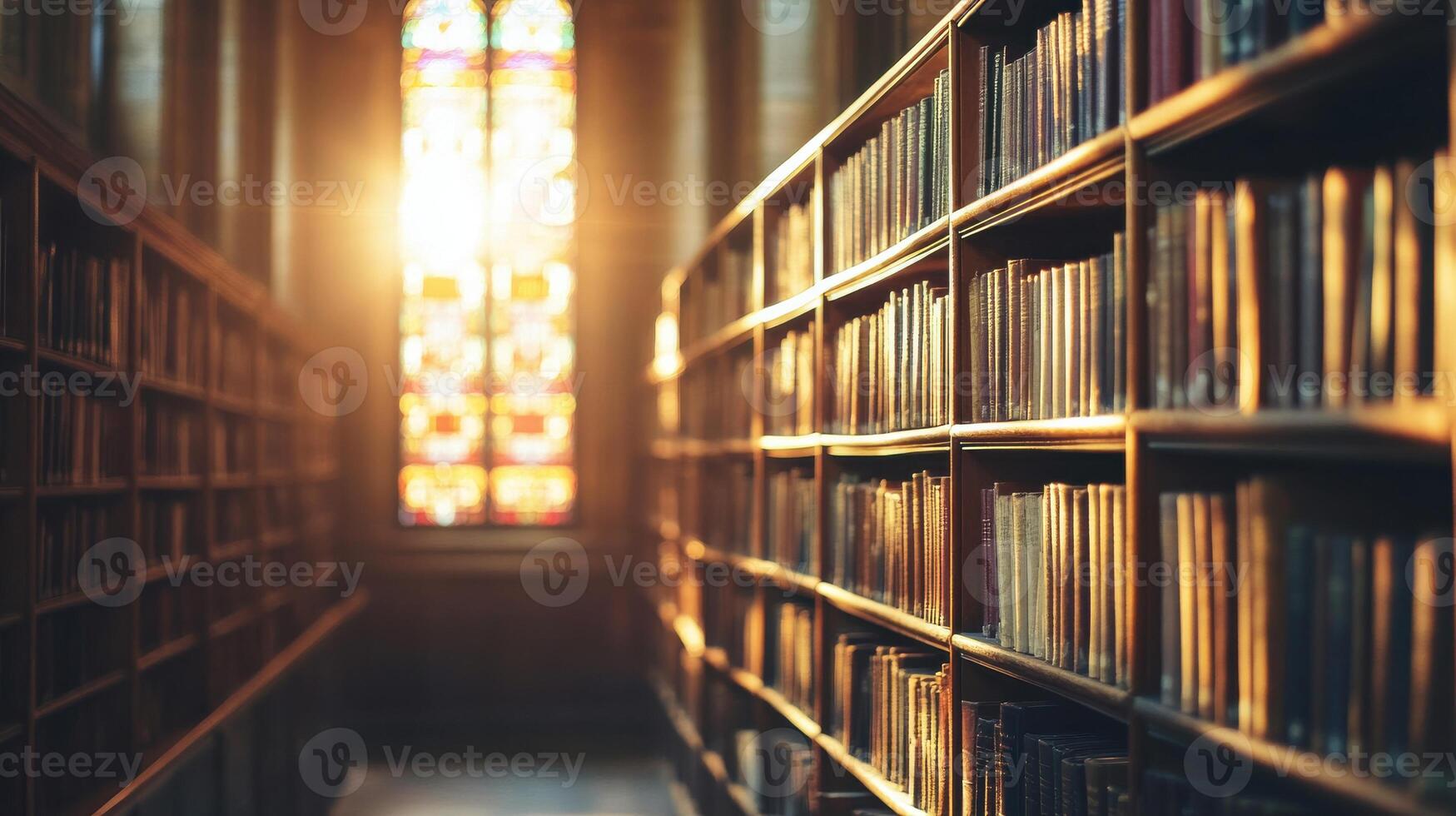 A long row of bookshelves in a library with sunlight shining through Pro Photo