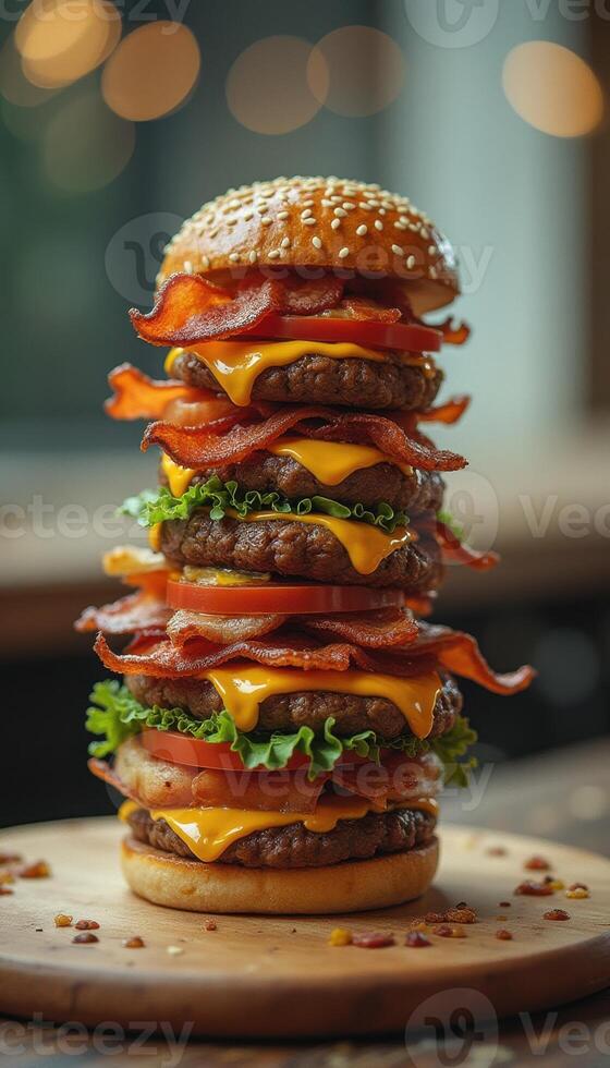 A large stack of bacon, cheese and lettuce on a hamburger Pro Photo