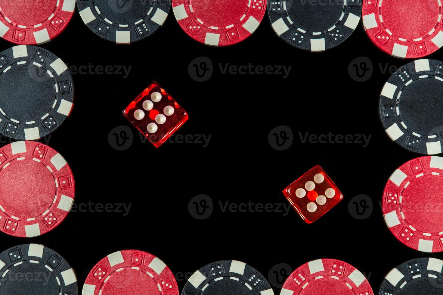 Red dice with a maximum winning combination of twelve in Craps on black table and chips Pro Photo