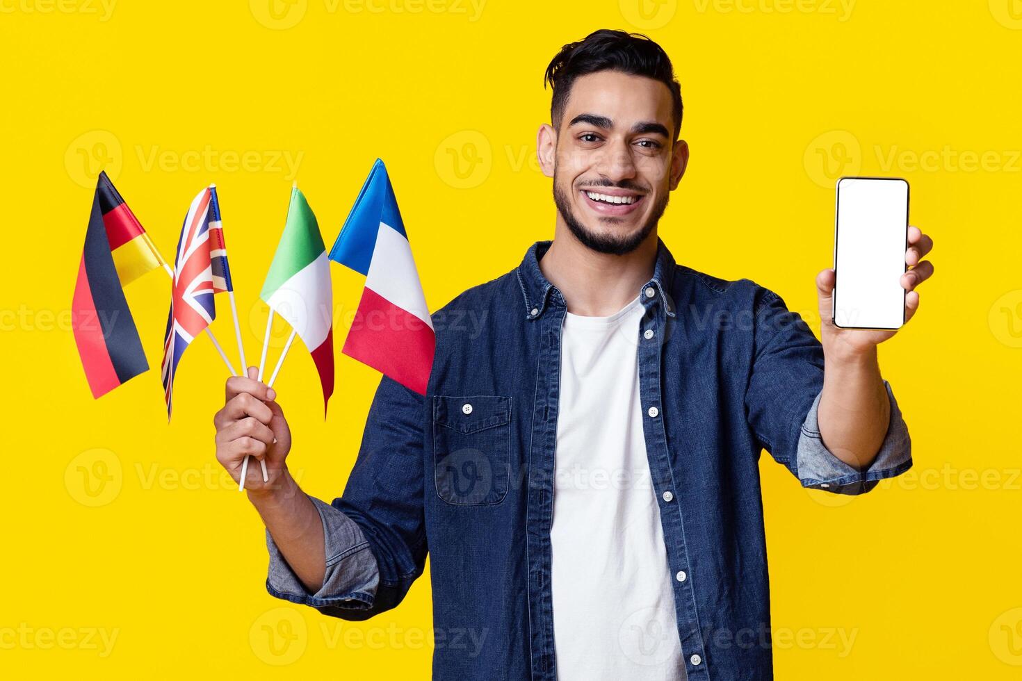 Happy arab man showing smartphone with empty screen and bunch of international flags, yellow studio background, panorama, mockup. Foreign language learning mobile application concept Pro Photo