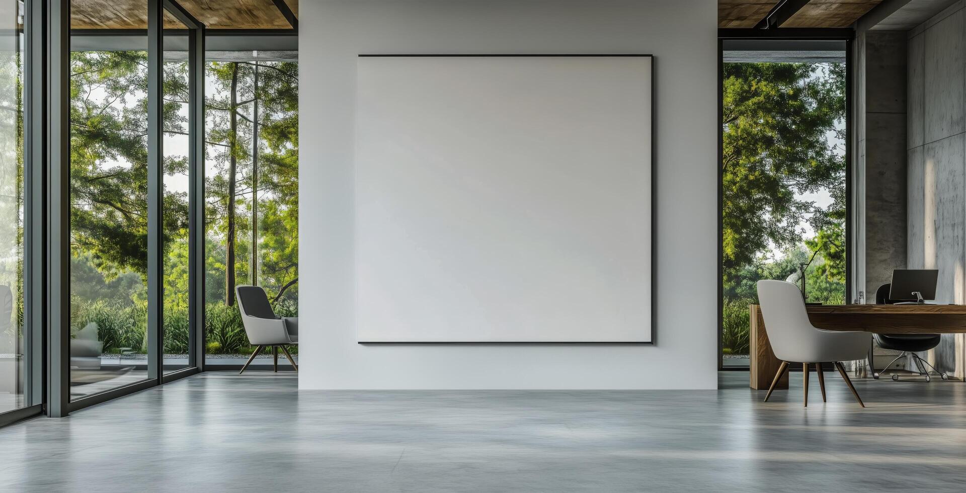 Modern Art Gallery Space Featuring Empty Canvas and Large Windows Showcasing Greenery photo