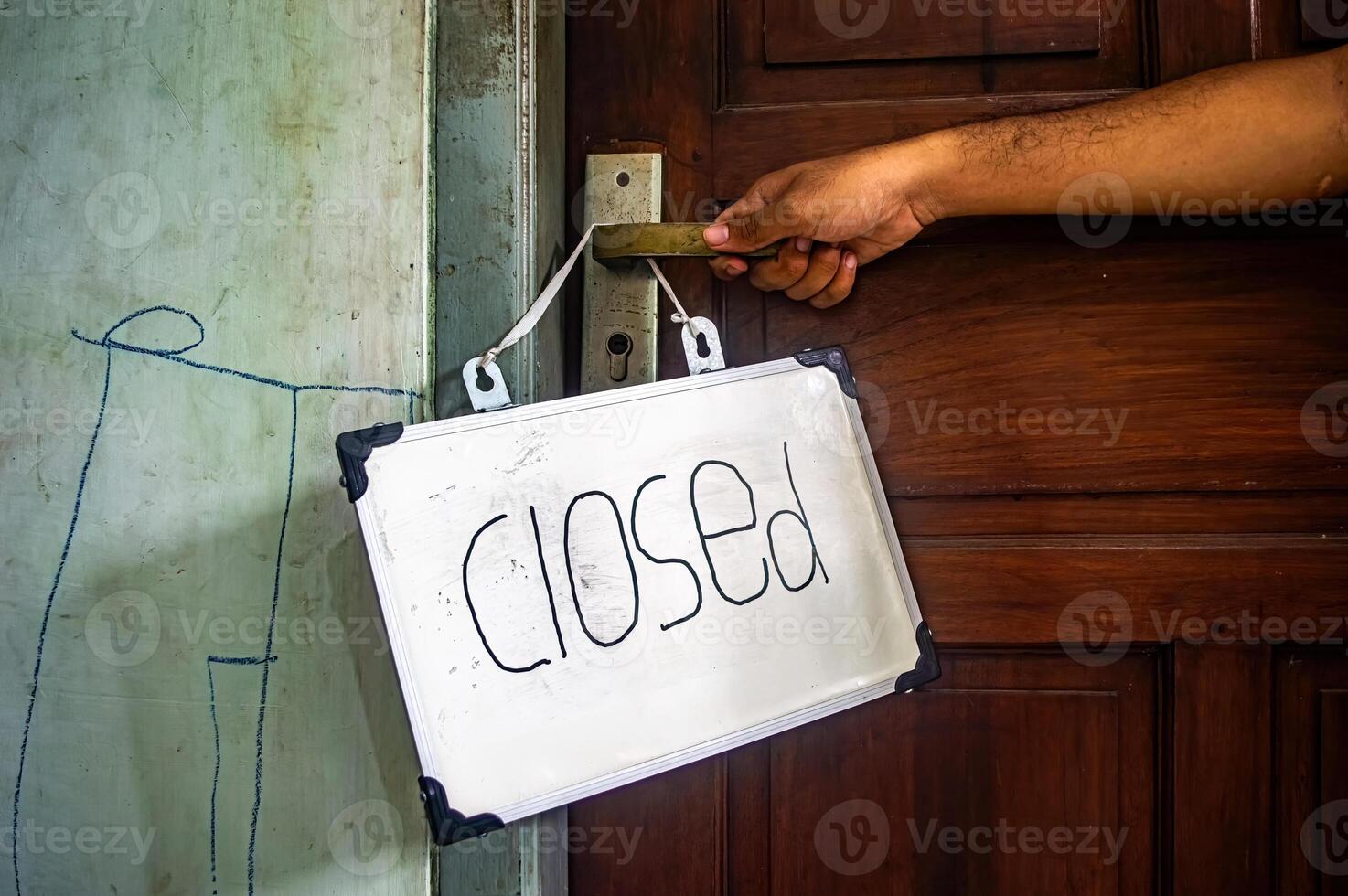 Hand holding door handle with hanging closed sign, symbolizing boundaries, pause, and personal space in a quiet, mindful setting Pro Photo
