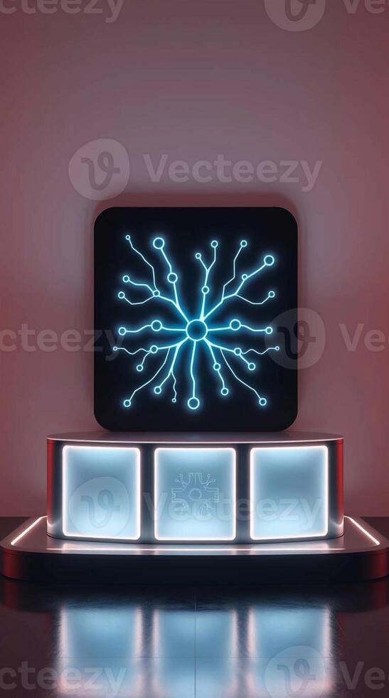 Futuristic digital display showcasing a glowing blue neural network pattern on a sleek illuminated stand Pro Photo