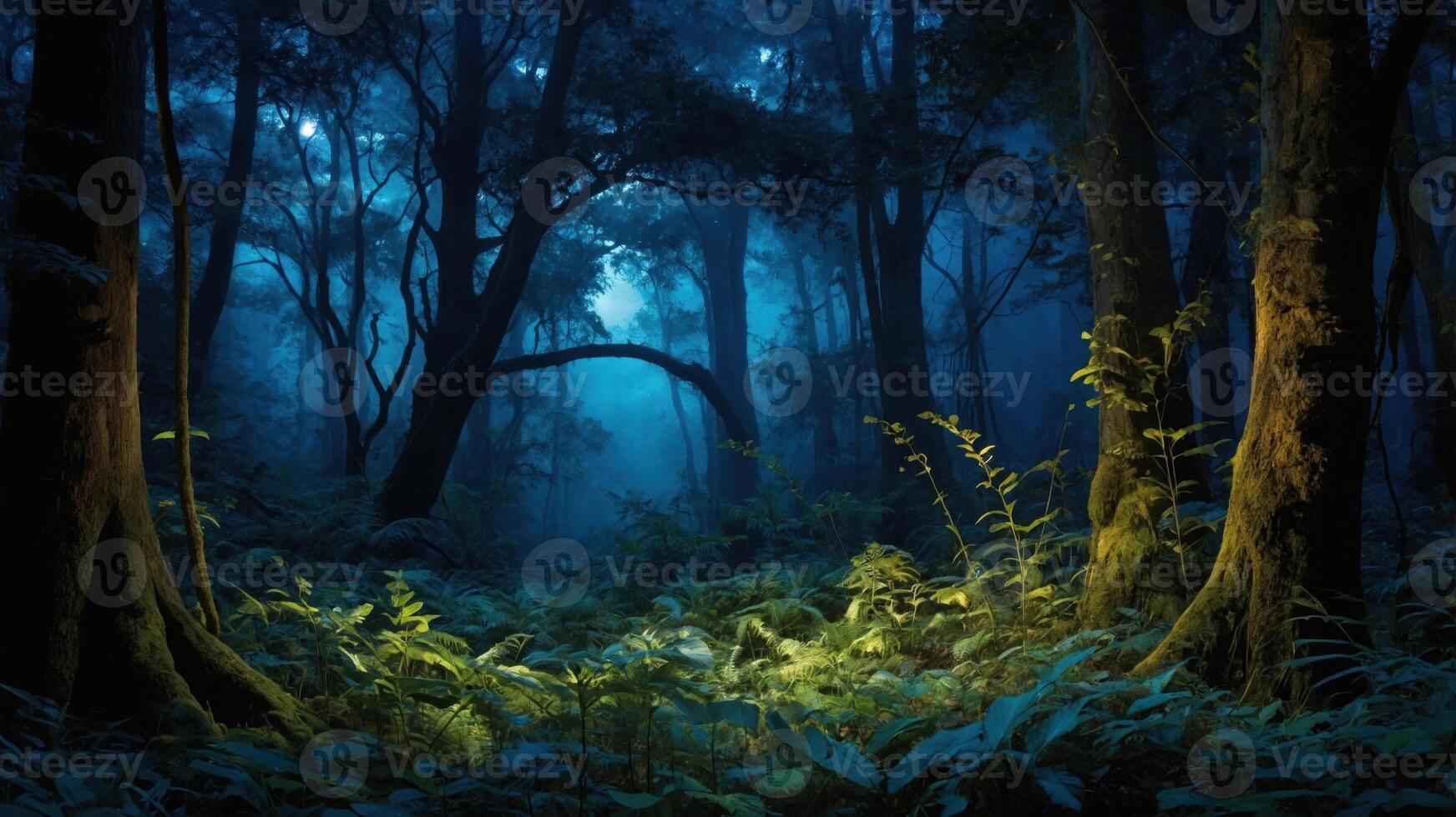Mystical forest scene at twilight with glowing foliage and misty background creating an enchanting atmosphere Pro Photo