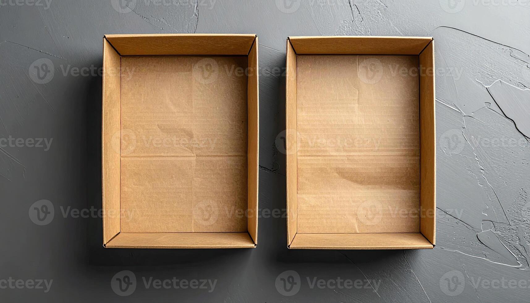 Two empty cardboard boxes on a gray textured surface Pro Photo