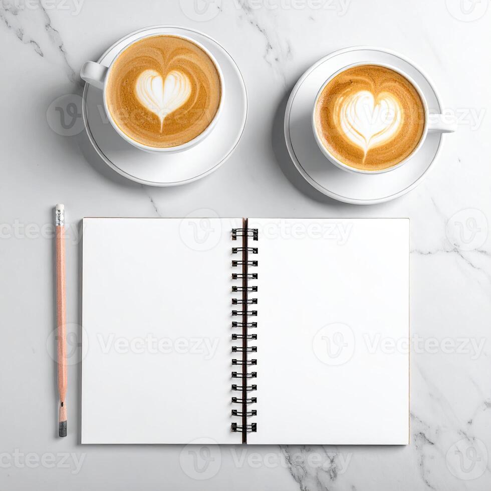 Two cups of latte art atop a marble surface, with an open spiral-bound notebook and pencil Pro Photo