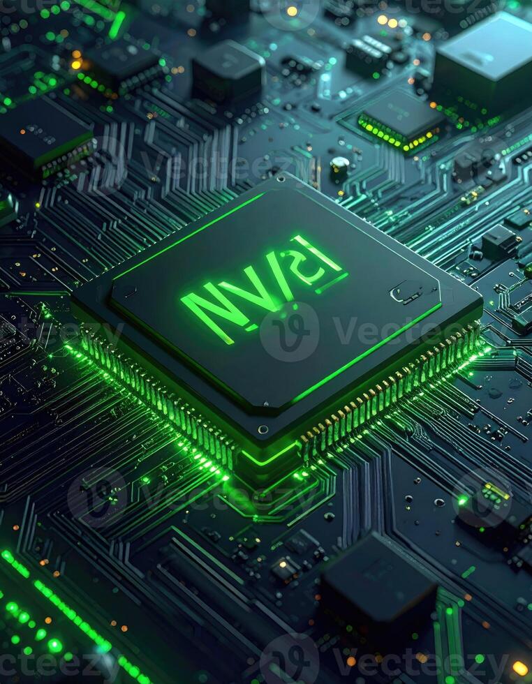 Close-up of a processor chip on a circuit board, highlighted with vibrant green light Pro Photo