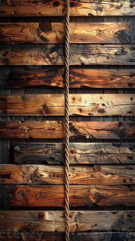 Close-up of a rustic wooden wall with a rope running vertically. Wooden planks of varying shades of brown and light brown are arranged in horizontal rows. A piece of rope is centered vertically. The lighting highlights the wood's texture and the rope Pro Photo