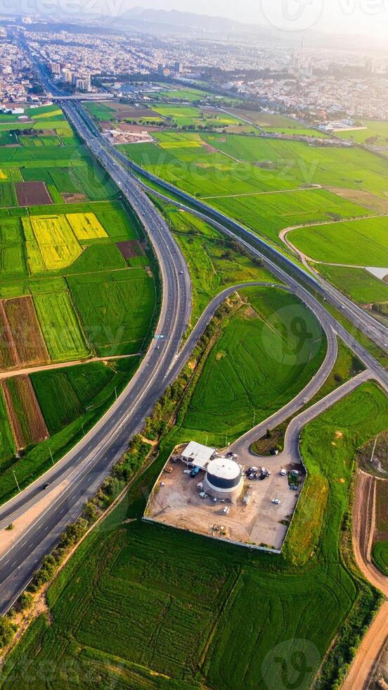 High-angle view of a highway intersecting farmland. Highway system curves through vibrant agricultural fields. Small service station visible. Cityscape in the distance Pro Photo