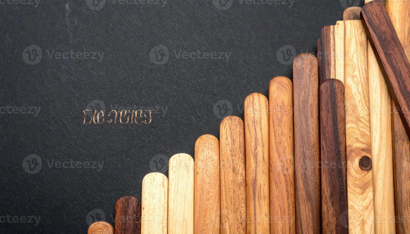Wooden slats arranged in a diagonal pattern on a dark slate surface. Text subtly visible Pro Photo