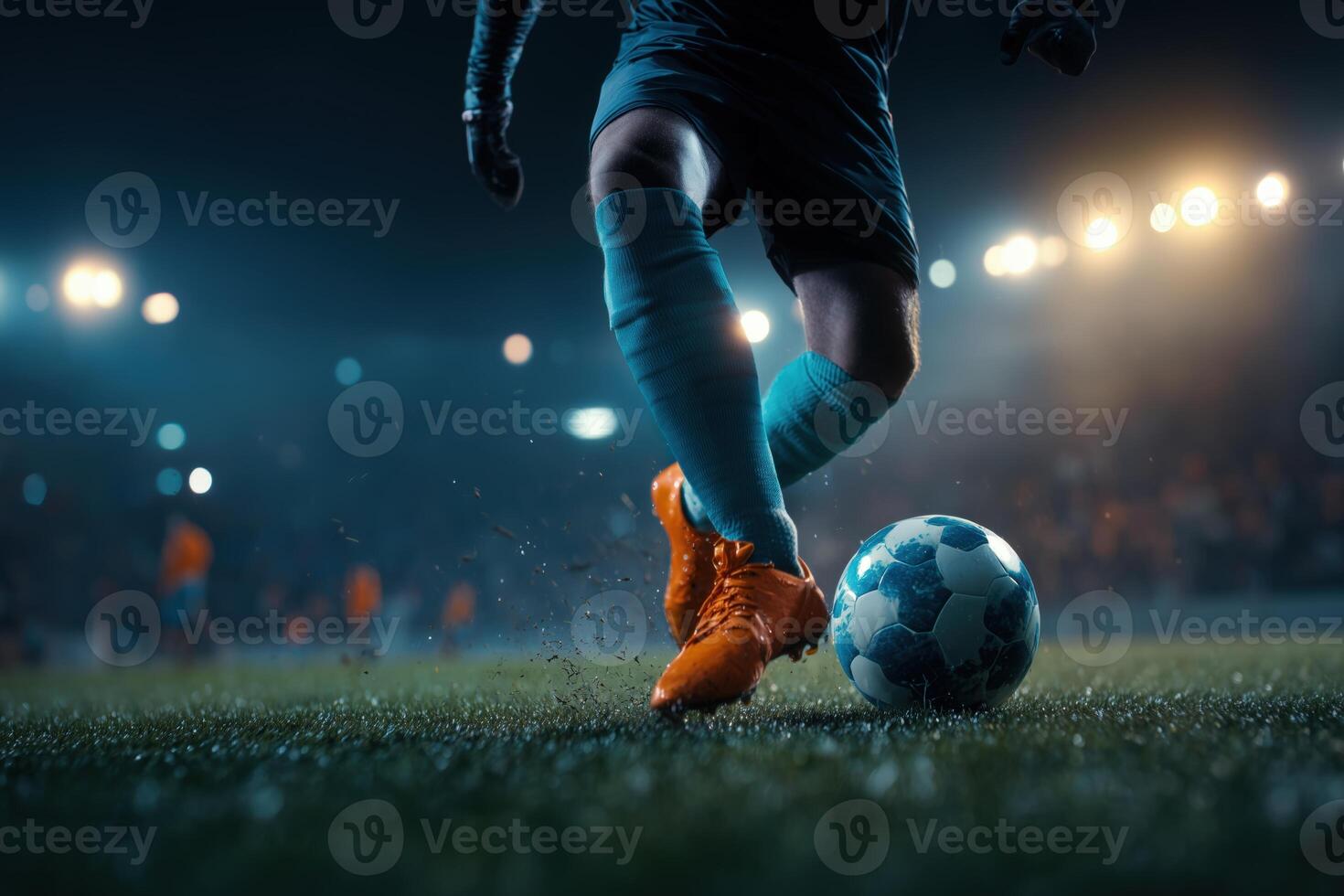 Exciting soccer match under floodlights with players and a ball on the field during a competitive game Pro Photo
