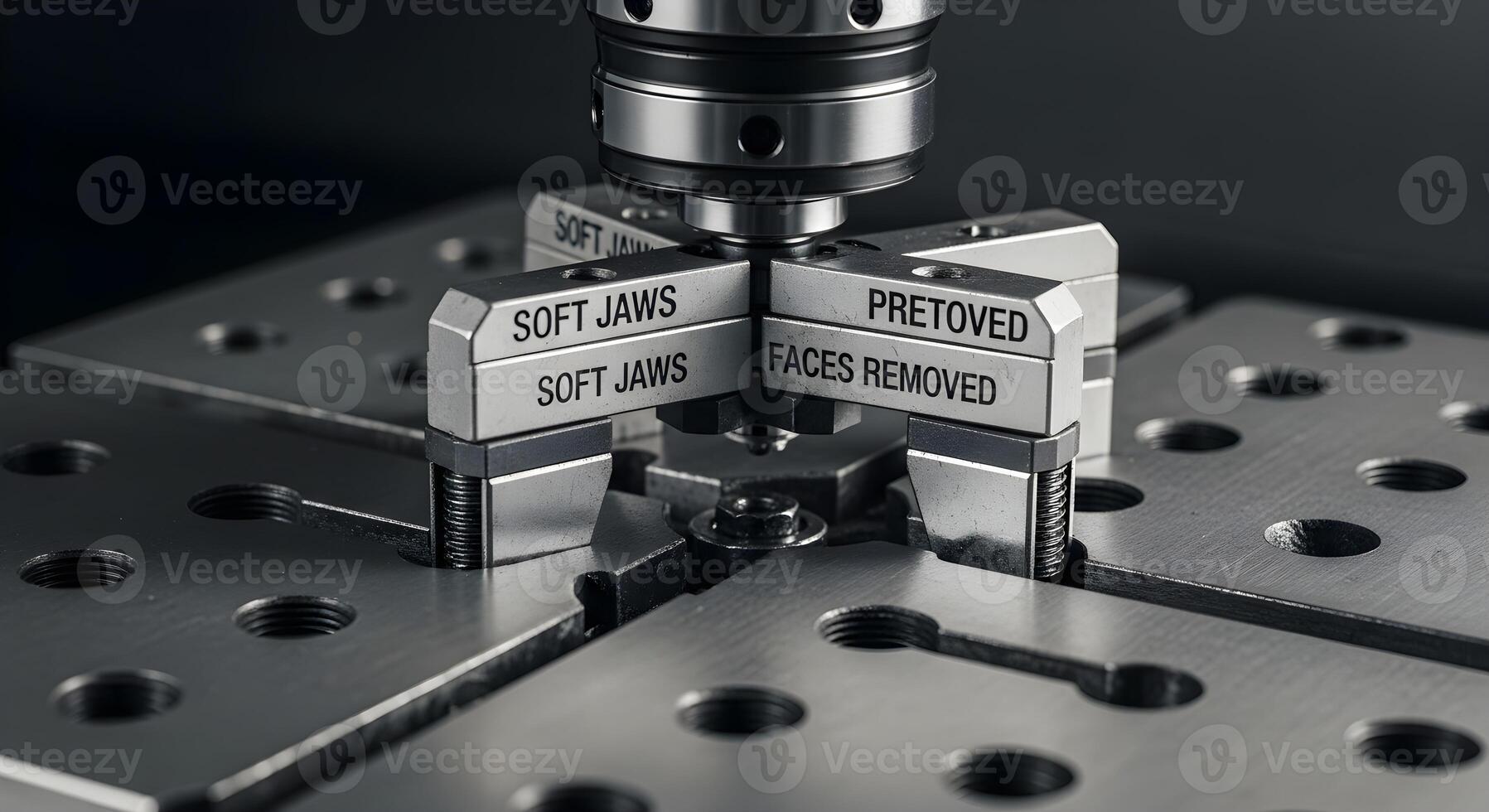 Soft jaws with removed faces clamped lightly in a fixture plate grid with threaded holes and perfect alignment Pro Photo