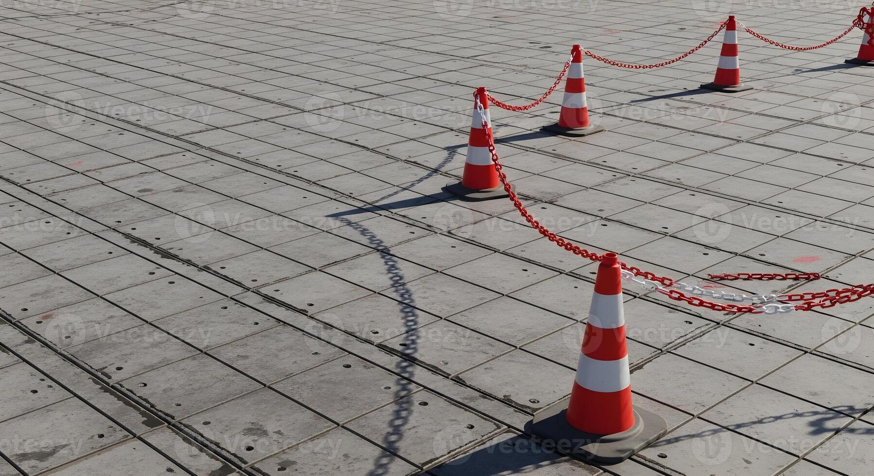 Traffic cones and barrier chain forming a curve within formwork panel grid, emphasizing ultrasharp textures and crisp edges. Pro Photo