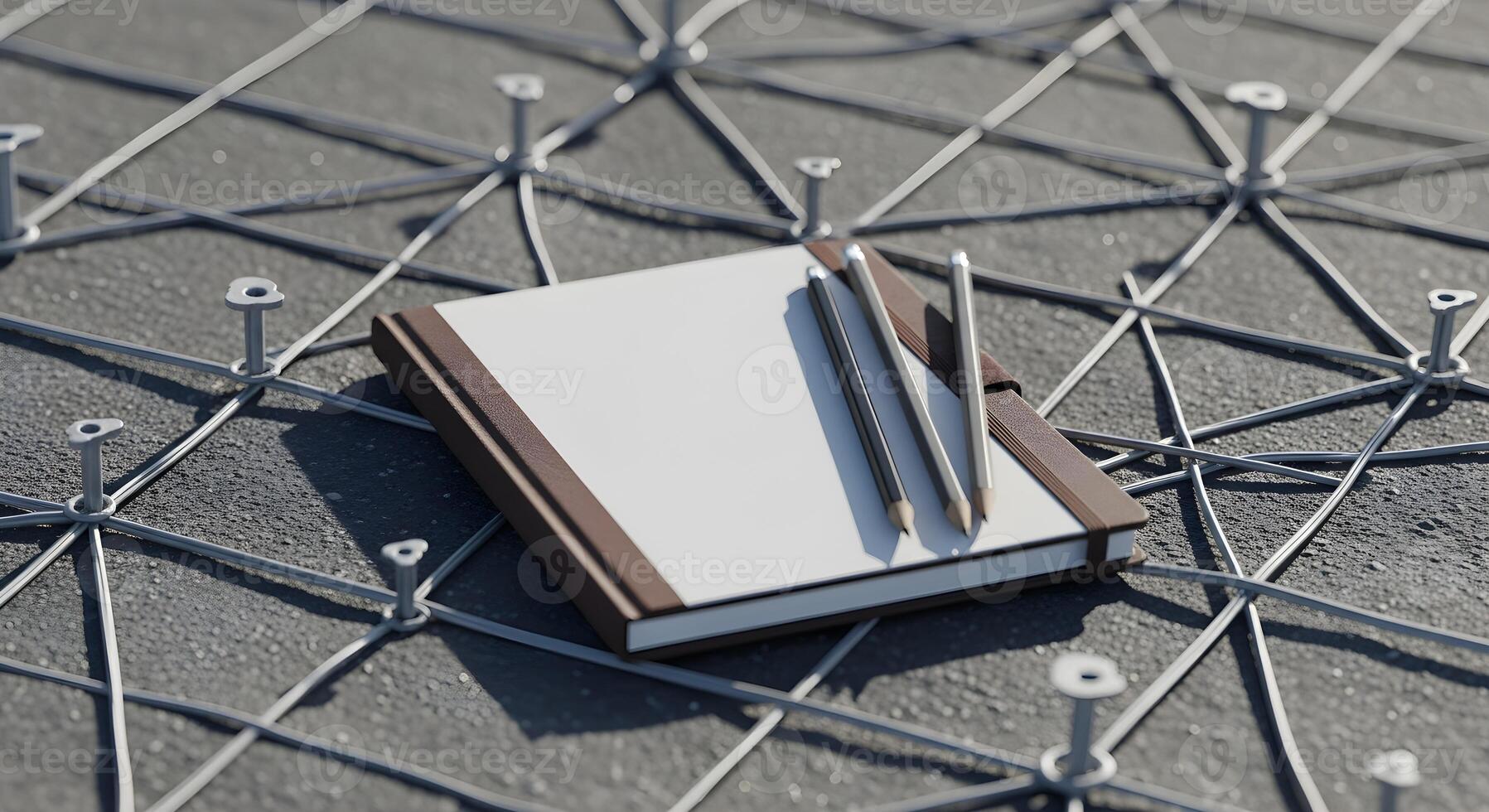 Field notebook with pencils in slope stabilization grid with anchors and mesh, suitable for engineering, safety Pro Photo