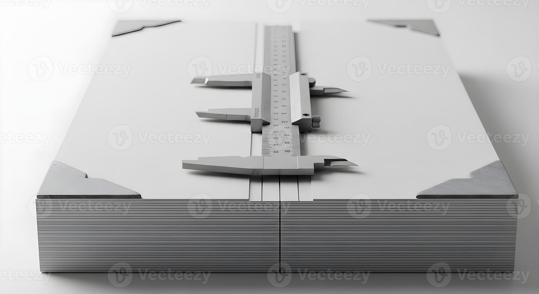 Metal ruler and caliper aligned on centerline in tracing stack with corner weights and smooth fibers, emphasizing ultrasharp textures Pro Photo