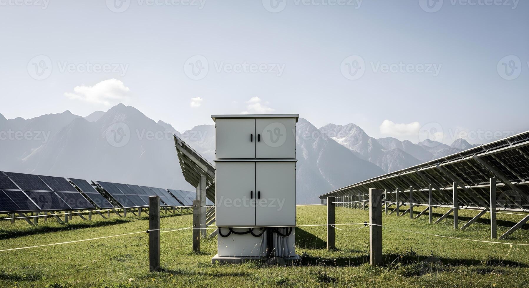 Renewable Energy - string combiner box with covers closed and no markings in alpine meadow edge with compact array Pro Photo