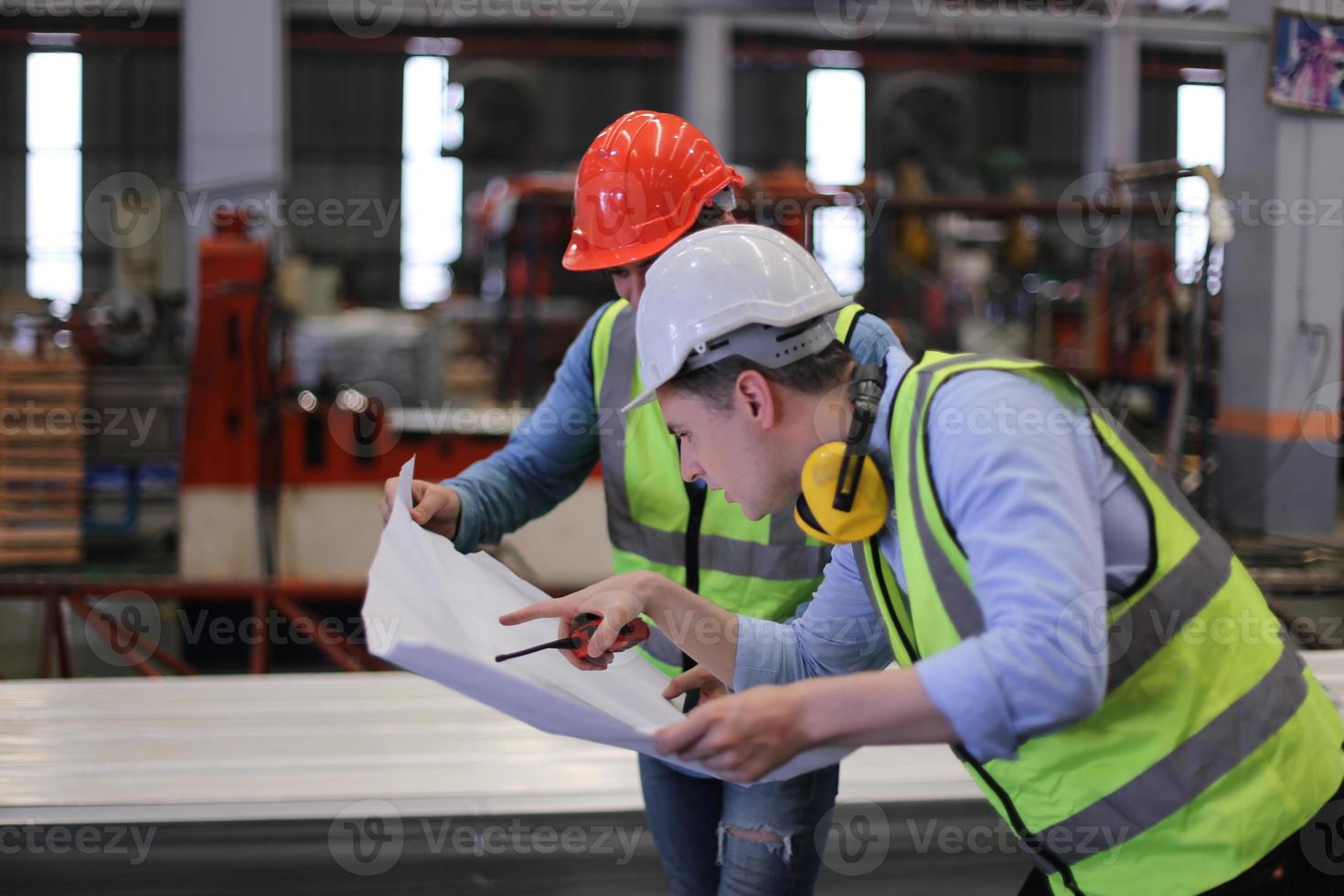 Men industrial engineer wearing a safety helmet while standing in a heavy industrial factory. The Maintenance looking of working at industrial machinery and check security system setup in factory. Pro Photo
