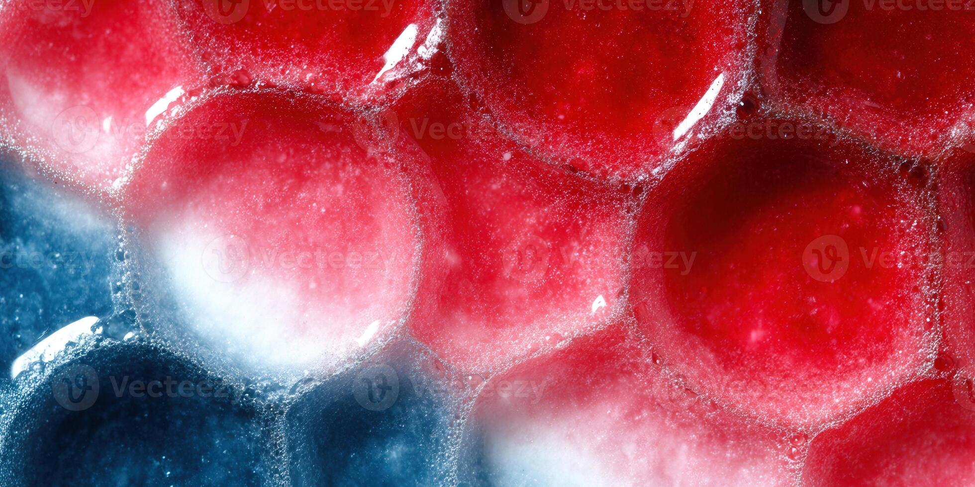 An abstract macro shot featuring a mix of red, white, and blue colors, with a cell-like pattern. Pro Photo