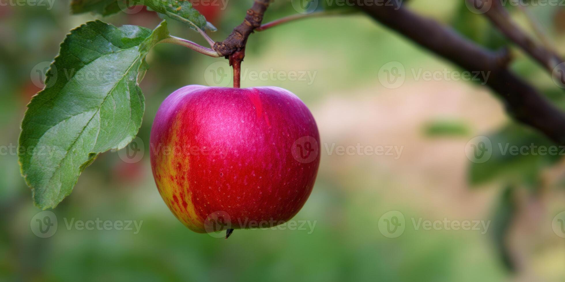 A single, vibrant red apple hangs from a tree branch, with green leaves and soft background. Pro Photo