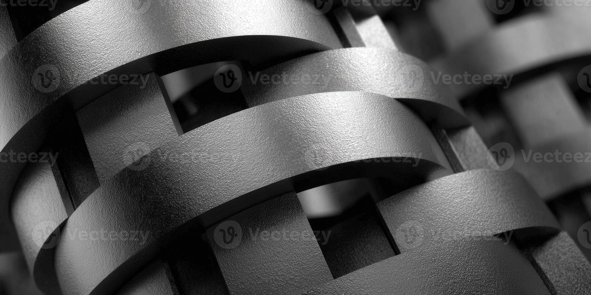 A close-up of an abstract, interwoven design with textured, metallic bands in grayscale. Pro Photo
