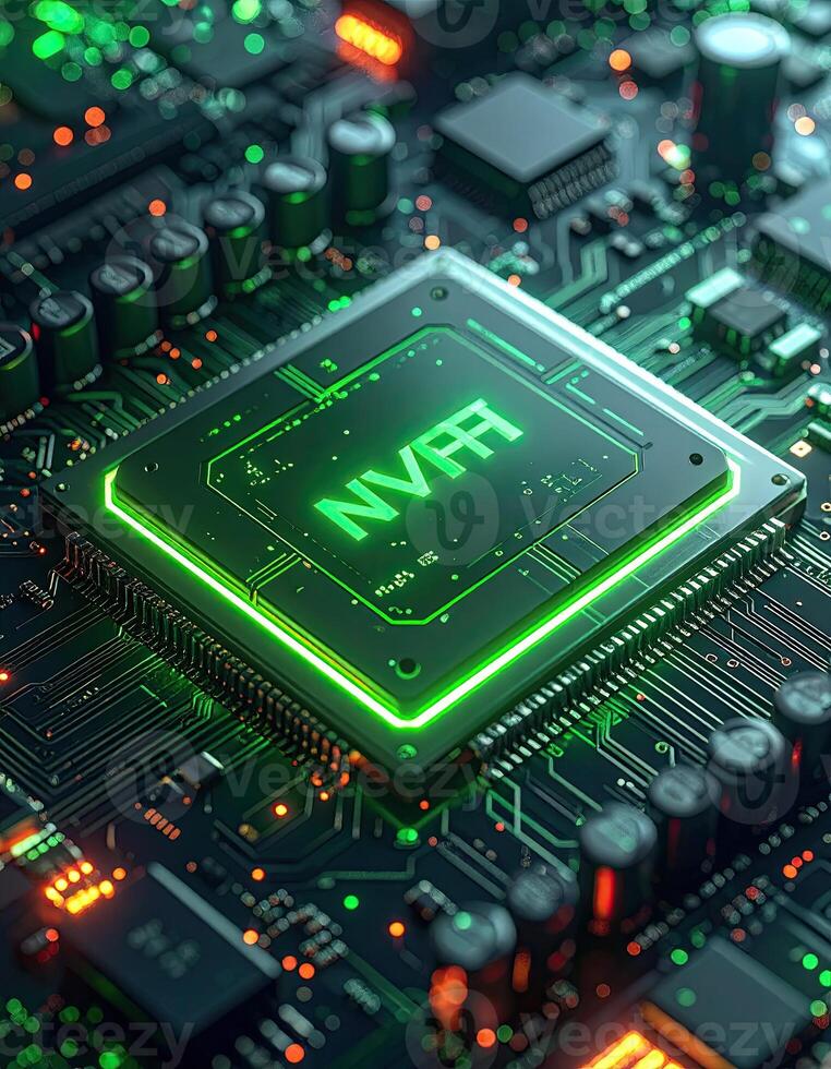 Close-up of a processor chip, highlighted with glowing green light, set against a complex circuit board with various electronic components Pro Photo