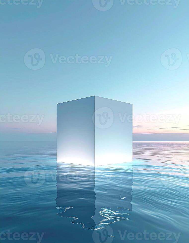 A large, white cube floats serenely on a tranquil sea, bathed in soft, ethereal light. The ocean's surface reflects the cube's shape, creating a serene and minimalist scene. The sky blends soft pastel hues of blue and pink, hinting at dawn or dusk Pro Photo