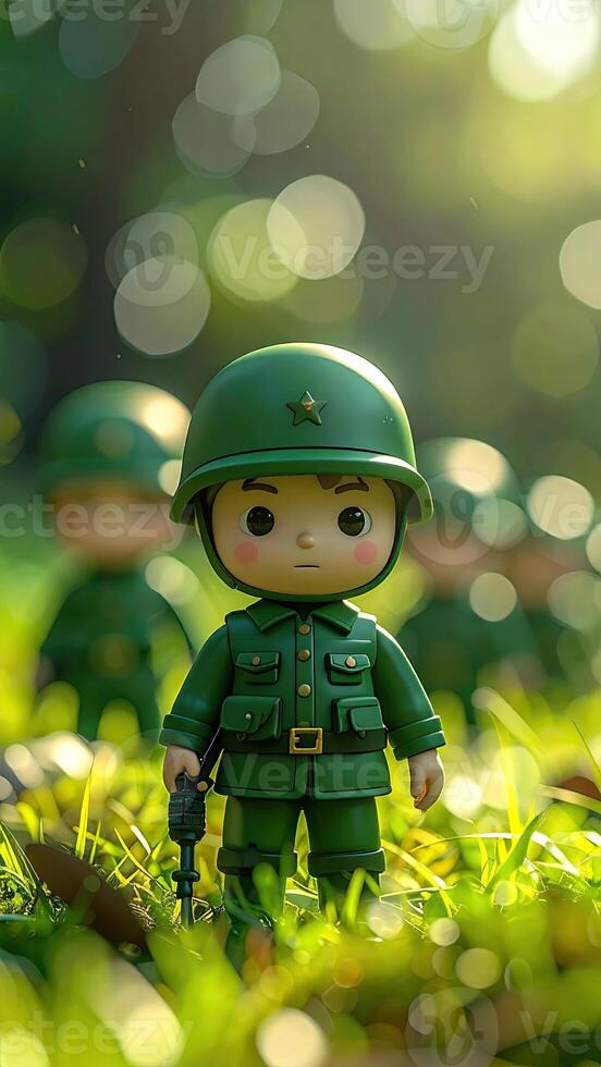 A figurine of a child soldier in a green uniform stands in a grassy field, with out-of-focus figures of other soldiers in the background. Soft lighting and bokeh create a serene atmosphere Pro Photo