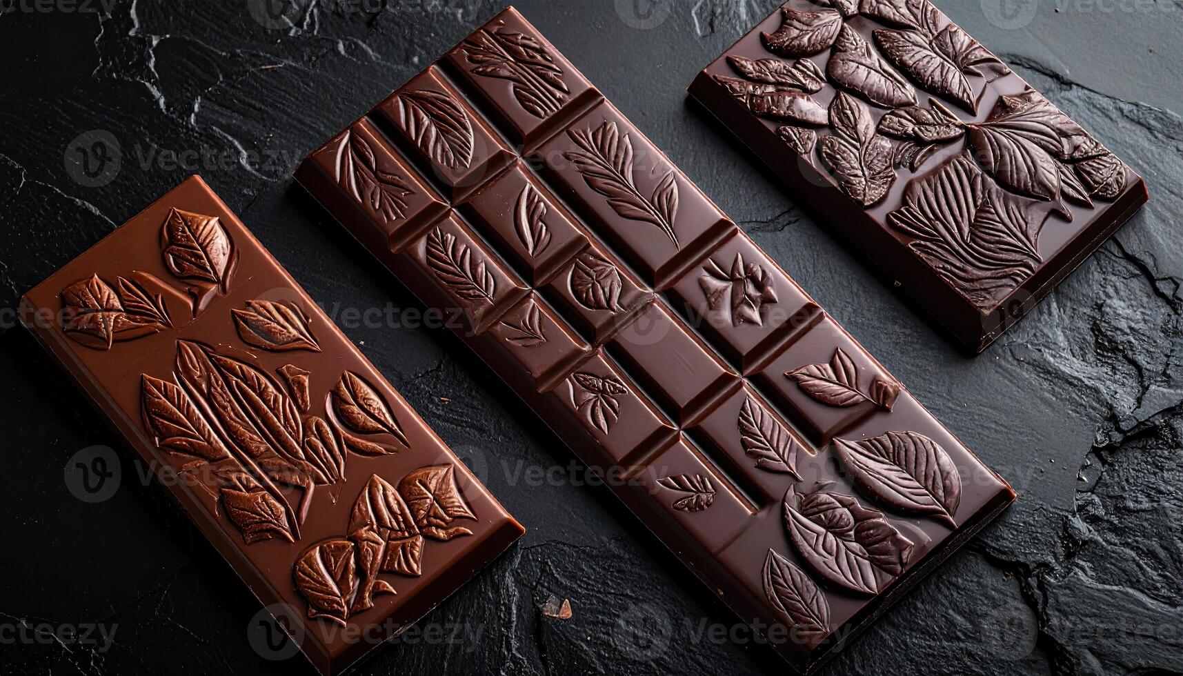 Three dark chocolate bars, arranged on a dark stone surface, each with intricate leaf patterns embossed Pro Photo