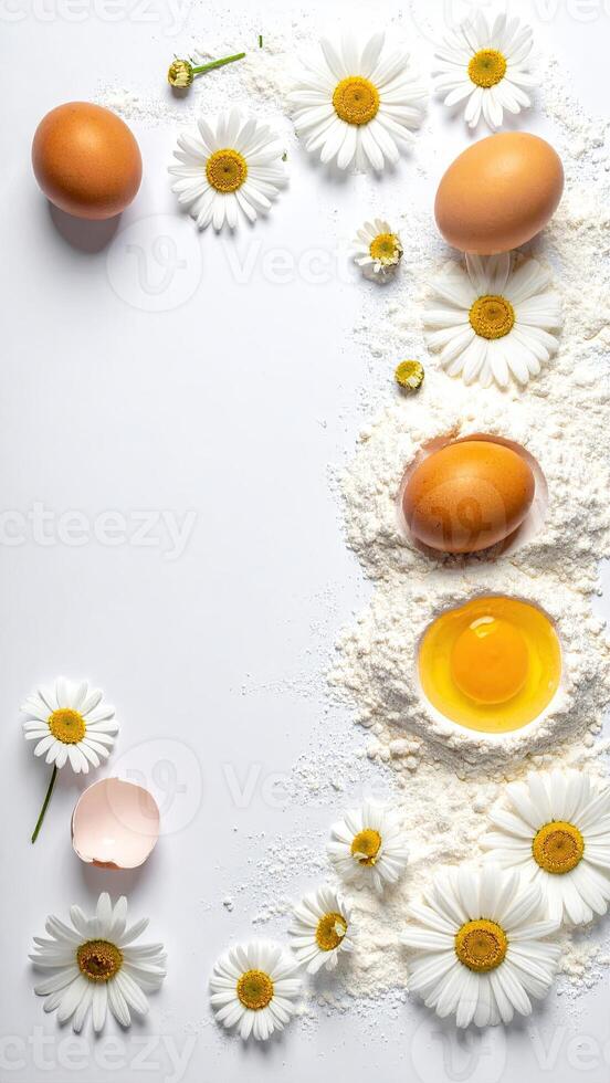 Eggs, flour, and daisies arranged on a white background. A broken egg shell is at the bottom left. Flour is scattered, creating wells for eggs Pro Photo