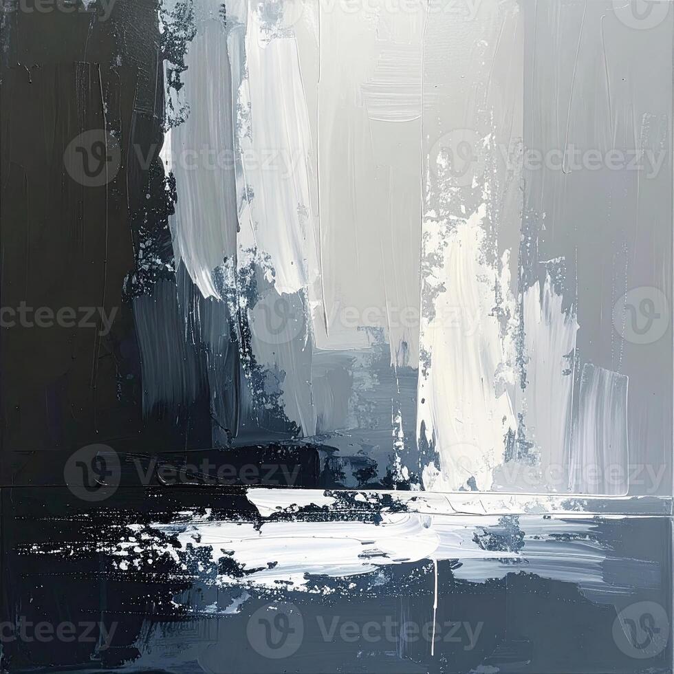 Abstract cityscape, grayscale hues. Thick, layered brushstrokes create vertical forms, transitioning from dark to light. Soft, diffused light suggests a hazy atmosphere. A horizontal plane of muted tones fills the lower portion Pro Photo